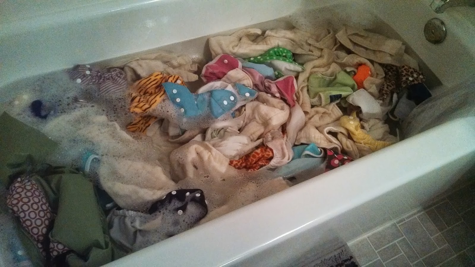 Stripping the cloth diapers simply means taking some steps to remove any possible build up of detergent, hard water minerals, odors etc. Generally, this can be done every month or so of using your cloth diapers…it’s basically a deep cleaning to ensure your diapers retain their absorbency. I did this by filling my bathtub with hot water, squirting in some dawn dish soap (the original blue bottle) and throwing in all the prefolds and covers. Swirl it all around to give it the agitation effect. If you have a top loader washer (which we do) you also do a soak cycle in the washer directly but I had read that the dawn in the washer can void your washer warranty so I did not want to risk that or any other malfunctions. After swirling it all around for about 10 minutes, I left it in there to soak overnight.