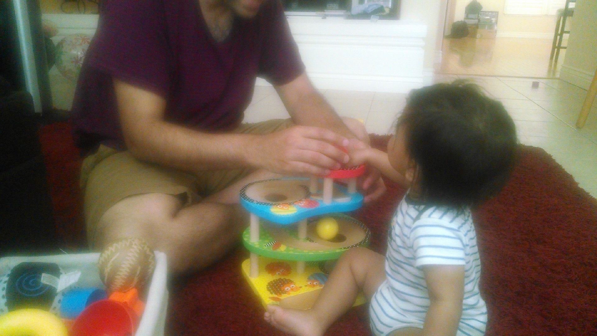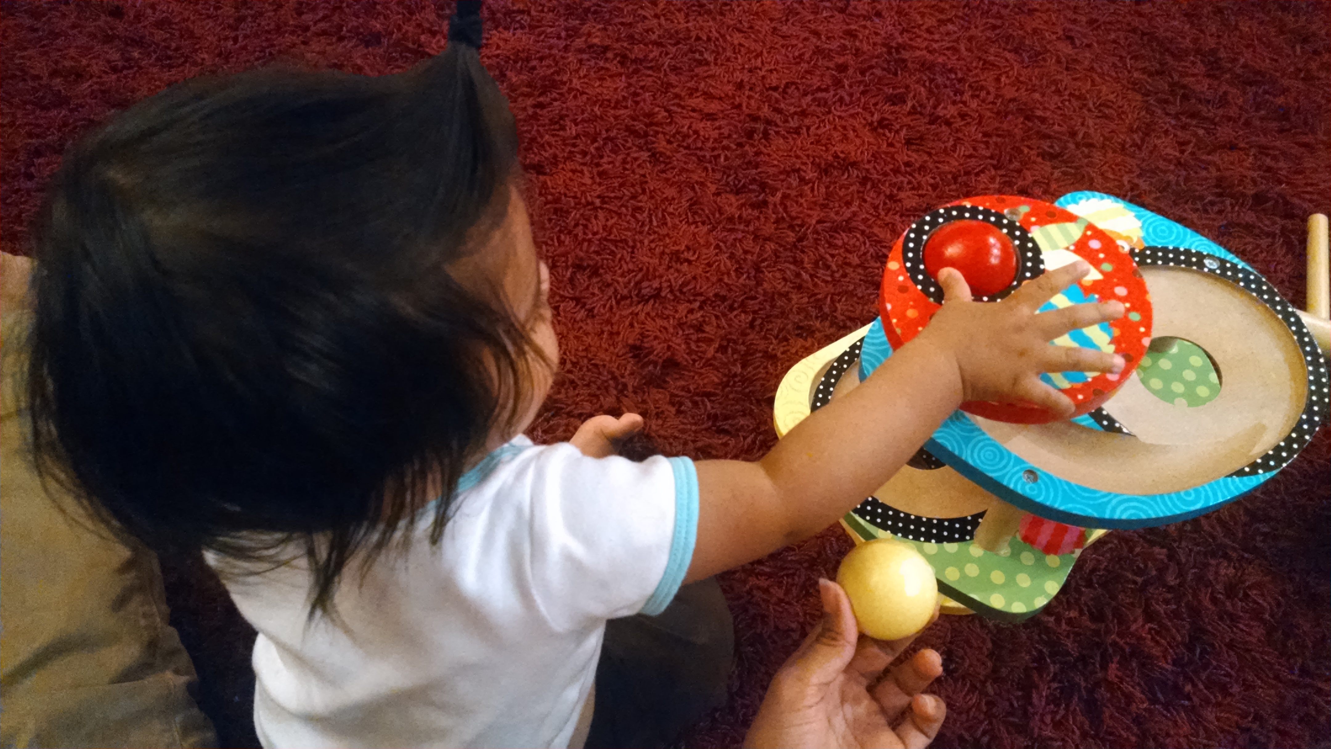 I watched my cousin play this toy with Toddler S (at the time Baby S). He talked about the ball, the shape, the color and what he was doing with it. He must’ve said the same thing 10xs to Toddler S but it kept him engaged, curious and wanting to play with the toy rather than dumping it after a few minutes. He never really told Toddler S what to do with it or forced the play on him. I continued playing this toy with him similarly in the days to come. After a week or so, suddenly Toddler S did what I was expecting him to do with the new toy multiple times in a row. He not only put the ball into the hole at the top of the wooden structure, he also tried slipping it in the hole half way down the structure. He tried pushing it from the bottle upwards. He was trying all sorts of other things with the ball and structure. Weeks later, he graduated from using the ball on the structure to putting various objects on the winding path of the structure further exploring this creative object.