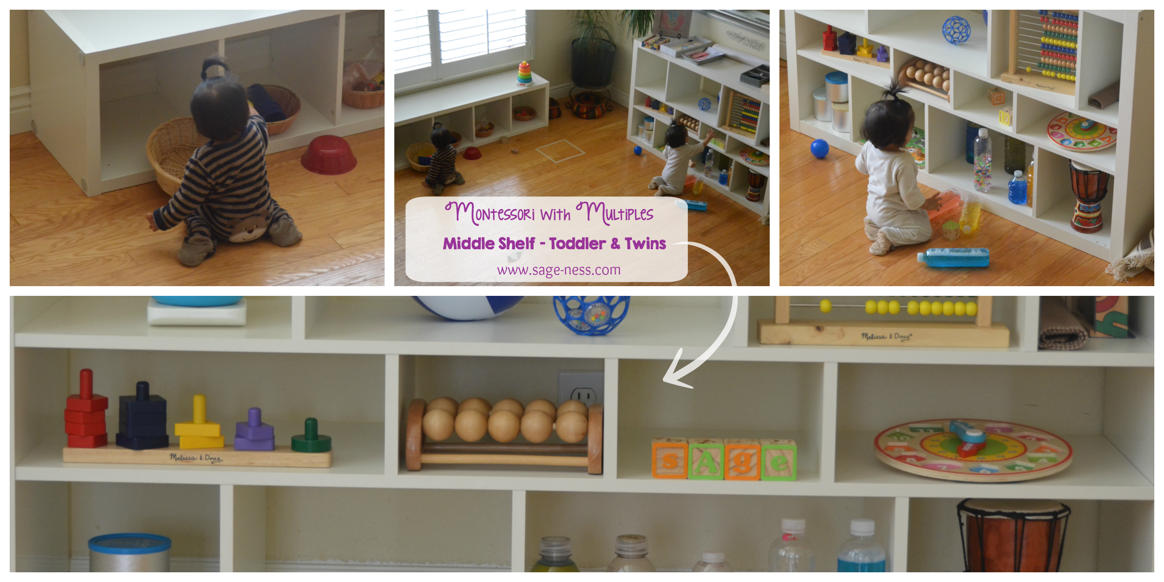 - Keeping things at the appropriate height/levels for each age group (lower shelves for twin babies and higher shelves for Toddler S)