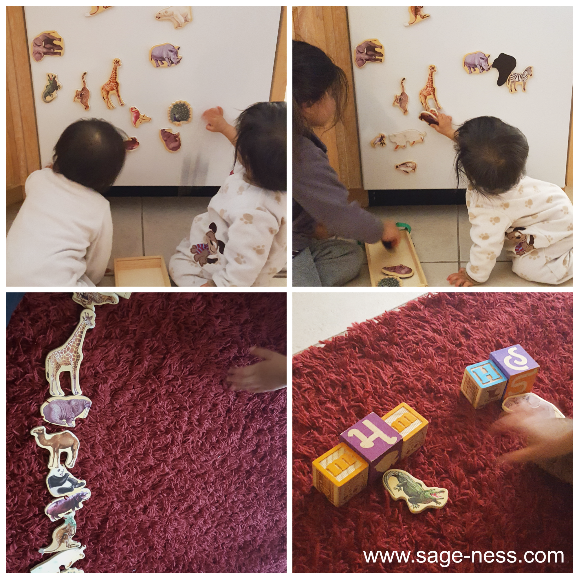 It has been very important for all of us to have an open mind & encourage creativity in how some of the activities are being used by the infant twins vs by Toddler S. The Babies may explore something which is appropriate for them but Toddler S will either play with it “correctly” because he has mastered it or will be creative in using it in a different way. It is fun to see Toddler S explore something which we perceive he has “mastered”. It reminds you that the sky really is the limit because there is no right or wrong way to some of the open ended play items. Their minds are so untainted. On the flip side, a new material Toddler S is learning with, the babies may use to make sounds, or explore at their own capacity. A great example of this was Toddler S’s animal magnets. Toddler S enjoyed learning about the different characteristics of these animals and was sorting them in various ways, or enjoyed playing ‘eye-spy’ with them on the floor or his white board. The Twins on the other hand used these same magnets to make noise with by tapping them on various objects or by sticking them and unsticking them from the dishwasher.